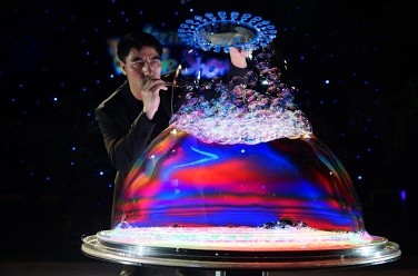 Ведь эта чудо-жидкость, кроме всего прочего, позволяет создавать самые необычные мыльные конструкции, например, стену из пузырей высотой в несколько десятков метров или (ещё один гиннессовский рекорд иллюзиониста) – «пузырь-матрёшку» с вложенными в неё 12-ю пузырями-полусферами!